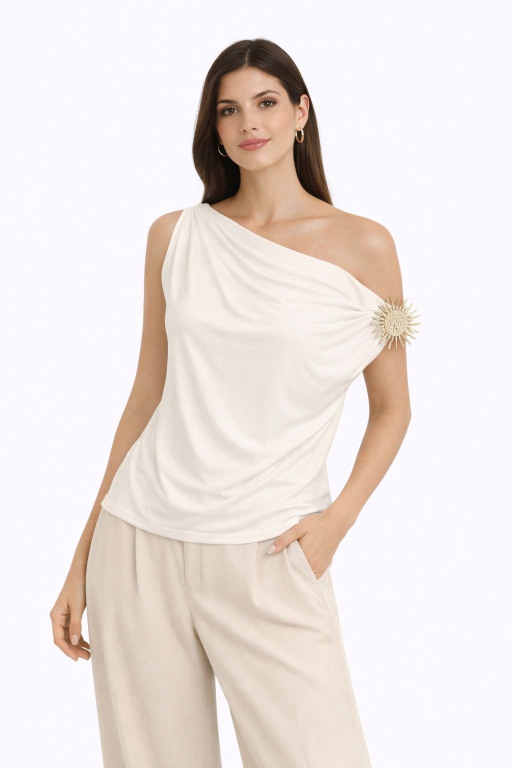 BLUSA BLANCA CON DETALLE EN HOMRBO RUNWAY